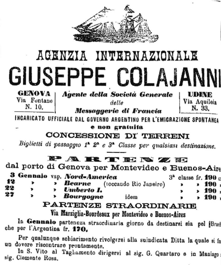 “Il Giornale di Udine” proseguirà con l’attenzione dedicata al fenomeno migratorio verso le Americhe e negli anni 1870-1880 comincerà a pubblicare i dati relativi ai nulla osta che coloro che volevano emigrare dovevano chiedere al loro sindaco per ottenere poi il passaporto e, nelle pagine della pubblicità, inseriva gli avvisi delle agenzie di viaggio e di navigazione che proponevano date e costi per l’imbarco verso il Sud America, in particolare da Genova ma anche da altri porti francesi e inglesi.