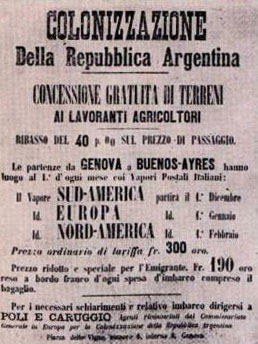 Ma non c’erano solo le pubblicazioni sui giornali: probabilmente le agenzie agivano anche attraverso altri canali, forse le stesse amministrazioni comunali e poi affiggendo manifesti in diversi comuni che propagandavano le favorevoli condizioni non solo per il viaggio ma anche per lo stabilirsi nel sud-America, in particolare in Brasile e in Argentina anche se spesso, come detto, queste promesse nascondevano colossali imbrogli. Ecco un prototipo di manifesto apparso in quegli anni.